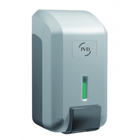 Distributeur de savon et gel CLEANLINE gris métallisé avec bouton poussoir et réservoir amovible.