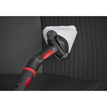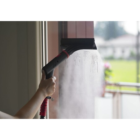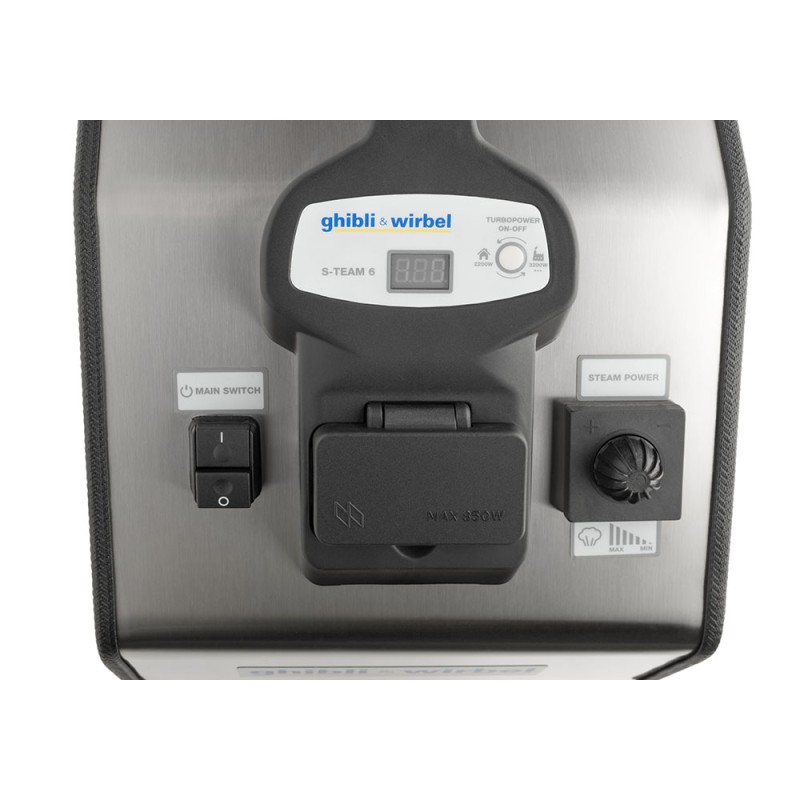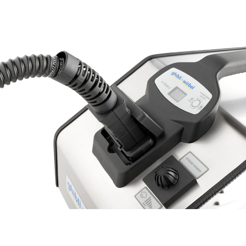 S-Team 6 est le générateur de vapeur professionnel conçu pour le nettoyage et l'assainissement des locaux et des surfaces. La production de vapeur sèche à 165 °C et une pression de fonctionnement de 6 bars, ainsi que la productivité élevée (il est possible de recharger la machine sans l'éteindre) garantissent d'excellents résultats de nettoyage sans utiliser de détergents. Pour la saleté la plus tenace, il est possible d'activer la Fonction «Eau Chaude», directement depuis la poignée du tuyau flexible. Un jet de vapeur humide à haute température (provenant directement de la chaudière) s’ajoute à la pulvérisation normale de vapeur sèche. La robustesse et la maniabilité font de S-Team 6 une machine extrêmement polyvalente qui peut travailler dans tout type d’environnement ; grâce à sa Fonction TurboPower, il est possible d'activer une ou les deux résistances de la chaudière, ce qui permet à la machine de fonctionner à 2200 W (en plus de la puissance maximale de 3200 W), en permettant ainsi de l'utiliser dans des environnements domestiques/commerciaux caractérisés par la présence de systèmes électriques à basse tension. Pour compléter l'offre, la large gamme d'accessoires standards et optionnels permet à S-Team 6 de travailler dans tout type d'environnement (sols, vitres, acier, tissus et surfaces dures).